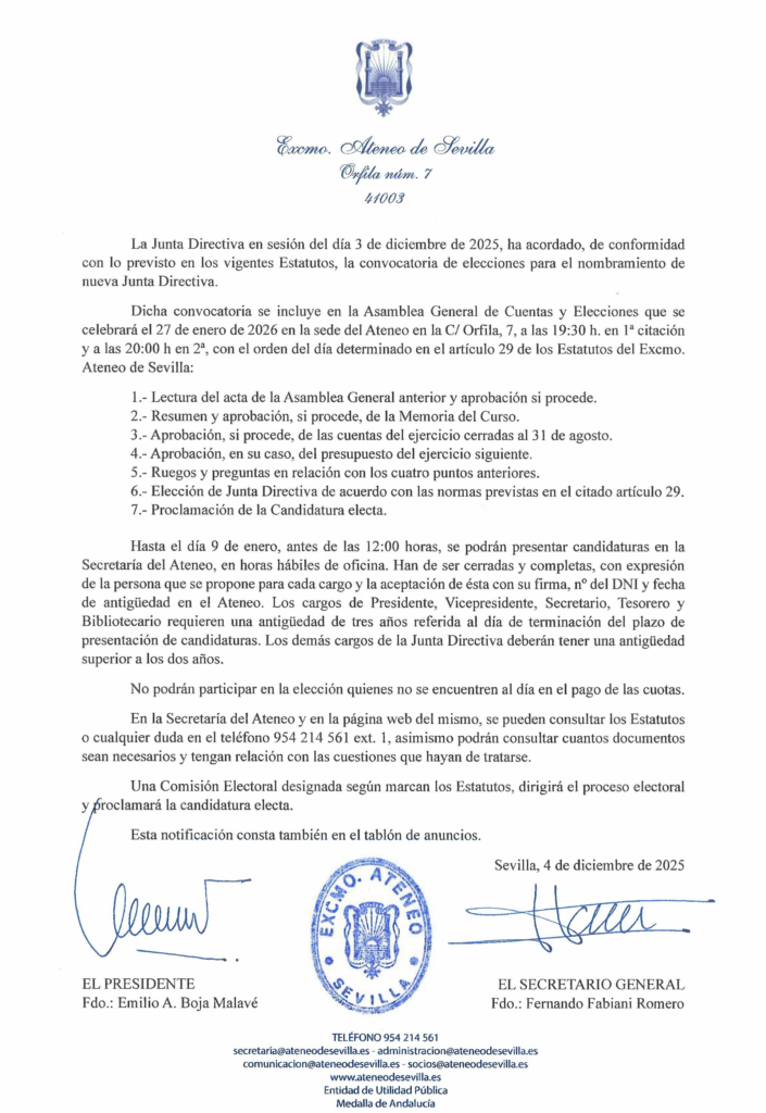 Le informamos que en el día de ayer, 3 de diciembre se reunió la Junta Directiva y se acordó convocar elecciones para el nombramiento de la nueva Junta Directiva. Dicha convocatoria se incluye en la Asamblea General de Cuentas y Elecciones que se celebrará el 27 de enero de 2026 en la sede del Ateneo, en C/ Orfila, 7, a las 19:30 h. en 1ª citación y a las 20:00 en 2ª.Más abajo se adjunta escaneada la citación en la que para aparece el orden del día.