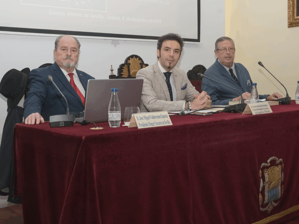El acto contó con la presentación de D. Miguel Cruz Giráldez, doctor en Filología Hispánica, quien introdujo la figura del conferenciante y destacó la importancia cultural y patrimonial del tema abordado. La sesión estuvo presidida por D. Pablo Borrallo Sánchez, Vocal Presidente de la Sección de Geografía e Historia del Excmo. Ateneo de Sevilla.