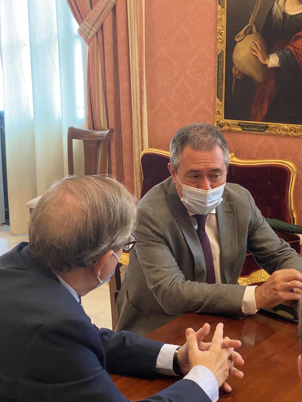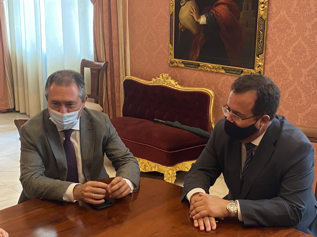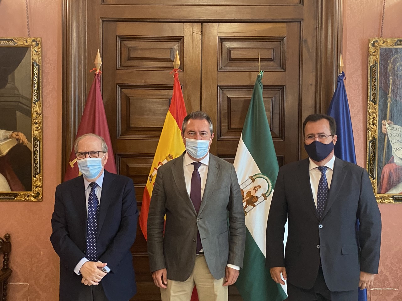 El alcalde de Sevilla, Juan Espadas, junto al delegado de Gobernación y Fiestas Mayores, Juan Carlos Cabrera, se ha reunido hoy con el presidente del Ateneo de Sevilla, Alberto Máximo Calero, para abordar distintas cuestiones relativas a la organización de la Cabalgata de Reyes Magos 2022.