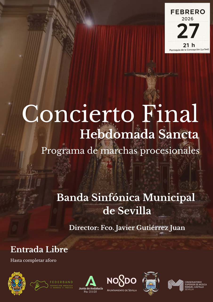 El próximo 27 de febrero a las 21h en la Parroquia de la Concepción (La Sed) se celebrará el concierto final de la Hebdomada Sancta, con un programa de marchas procesionales. de la mano de la Banda Sinfónica Municipal de Sevilla a cargo de la dirección de Fco. Javier Gutiérrez Juan , director de la banda.