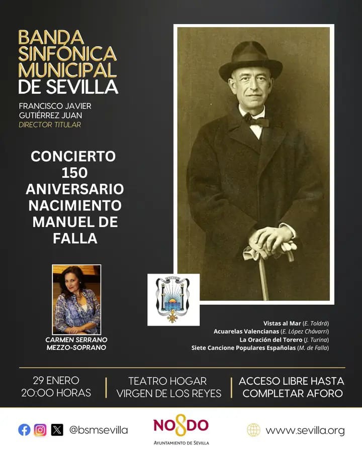 Mañana jueves, 29 de enero de 2026, a las 20:00 horas, tendrá lugar el concierto «La España de Manuel de Falla», a cargo de la Banda Sinfónica Municipal de Sevilla, organizado con motivo del 150 aniversario del nacimiento del compositor gaditano, una de las figuras más universales de la música española; el concierto se celebrará en el Teatro Hogar Virgen de los Reyes, estará dirigido por Francisco Javier Gutiérrez Juan y contará con la participación de la mezzo soprano Carmen Serrano, en una velada que rendirá homenaje al legado musical de Manuel de Falla y a su profunda influencia en la identidad sonora de España; el acto está organizado por la Delegación de Fiestas Mayores del Excmo. Ayuntamiento de Sevilla y cuenta con la colaboración del Excmo. Ateneo de Sevilla.