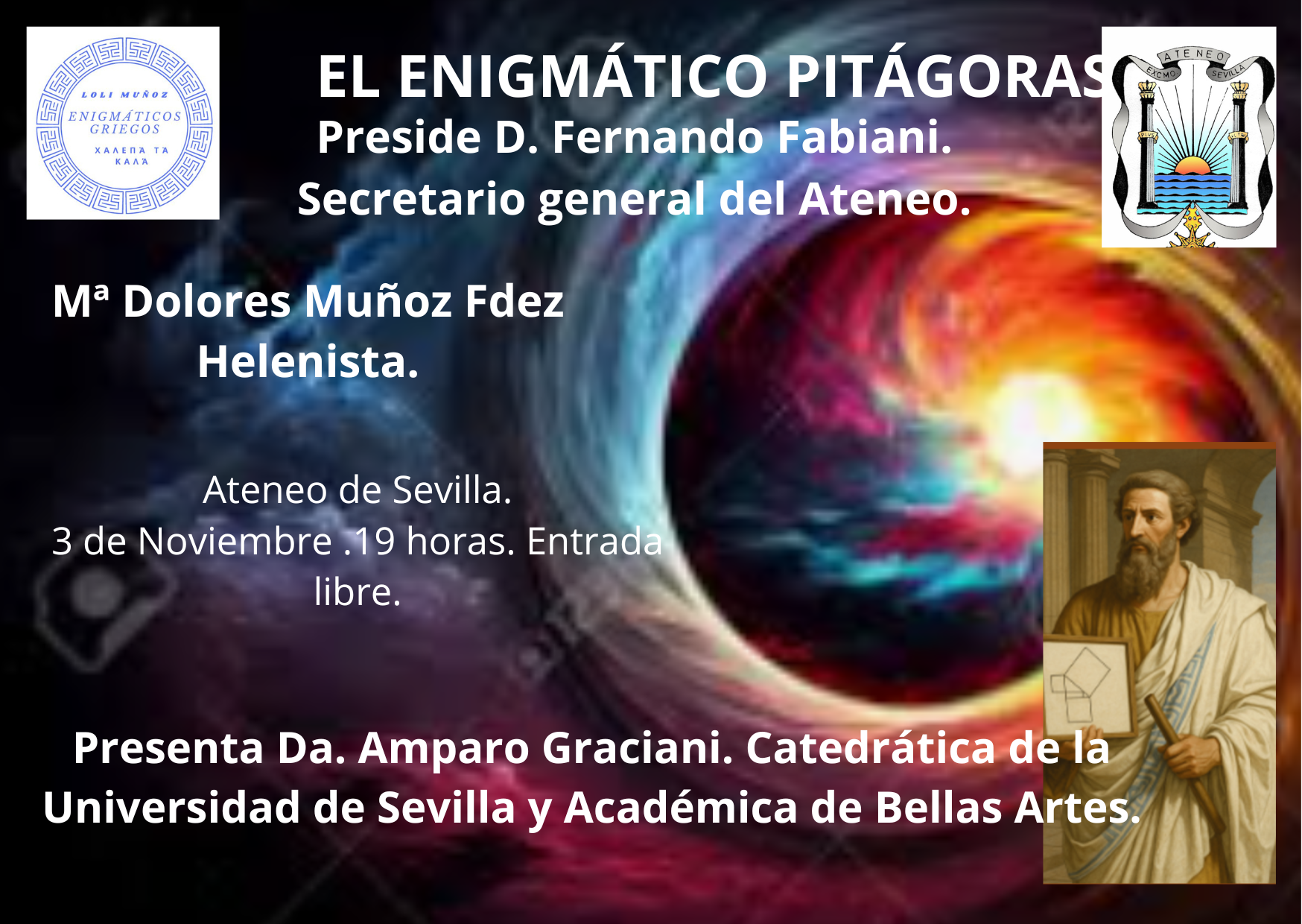 La conferencia será impartida por Dª María Dolores Muñoz Fernández, Helenista, Conferenciante y Escritora. Será presentado por Dª. Amparo Graciani García, Catedrática de la Universidad de Sevilla y Academia de Bellas Artes. El acto será presidido por D. Fernando Fabiani Romero, secretario general del Excmo. Ateneo de Sevilla. Tendrá lugar en el salón de actos de la docta casa el próximo lunes 3 de noviembre a las 19:00h.