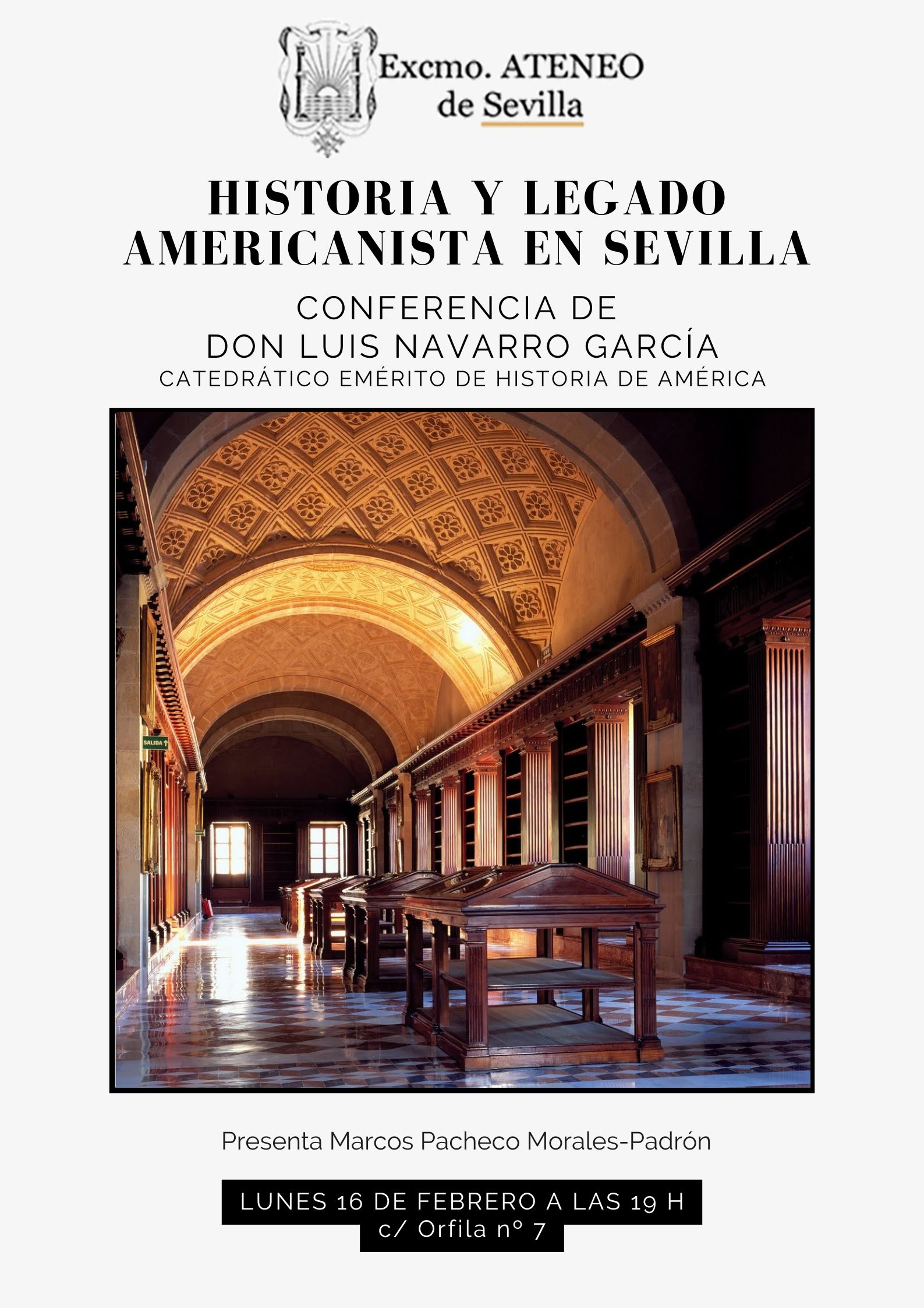 El Excmo. Ateneo de Sevilla tiene el gusto de invitarle a la conferencia «Historia y legado americanista en Sevilla», que será impartida por D. Luis Navarro García, catedrático emérito de Historia de América y una de las figuras de referencia en el estudio del americanismo sevillano.