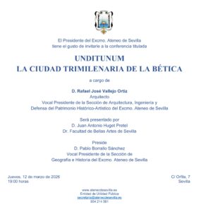 El Presidente del Excmo. Ateneo de Sevilla tiene el gusto de invitarle a la conferencia titulada «Unditunum. La ciudad trimilenaria de la Bética», que será impartida por D. Rafael José Vallejo Ortiz, arquitecto y vocal presidente de la Sección de Arquitectura, Ingeniería y Defensa del Patrimonio Histórico-Artístico del Excmo. Ateneo de Sevilla, y presentada por D. Juan Antonio Huget Pretel, doctor de la Facultad de Bellas Artes de Sevilla; el acto estará presidido por D. Pablo Borrallo Sánchez, vocal presidente de la Sección de Geografía e Historia del Excmo. Ateneo de Sevilla, y se celebrará el jueves, 12 de marzo de 2026, a las 19:00 horas, en la sede del Ateneo de Sevilla, situada en la calle Orfila, 7, Sevilla.
