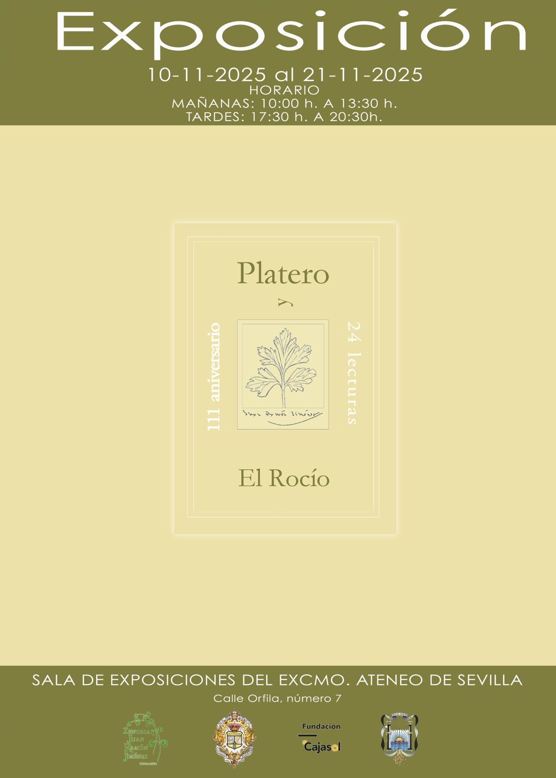 El Presidente del EXCMO. ATENEO de SEVILLA , D. Emilio A. Boja Malavé y el Presidente de la Junta de Gobierno de la Hermandad Matriz Nuestra Señora del Rocío de Almonte, D. Santiago Padilla Díaz de la Serna, se complacen en invitarle al acto de inauguración de la Exposición : Platero y El Rocío. 111 aniversario. 24 lecturas comisariada por Juan Villa, que tendrá lugar el próximo día 10 de noviembre a las 18:30 horas en la Sala de Exposiciones Gonzalo Bilbao del Excmo. Ateneo de Sevilla, C/Orfila, 7.