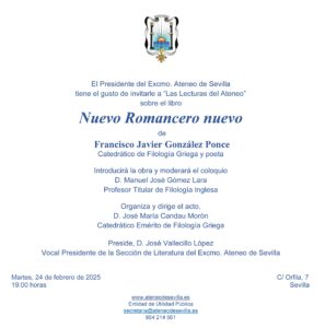 El próximo martes 24 de febrero a las 19.00h, tendrá lugar en el Excmo. Ateneo de Sevilla, una nueva cita con el ciclo «Las Lecturas del Ateneo» sobre el libro Nuevo Romancero Nuevo de Francisco Javier Gónzalez Ponce, catedrático en Filología Griega y poeta. Manuel José Gómez Lara, profesor titular de Filología Inglesa, será el encargado de introducir la obra y moderará el coloquio, y José María Candau Morón, catedrático emérito de Filología Griega, es el organizador y dirigirá el acto.