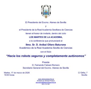 Conferencia dentro del Ciclo «Los Martes de la Academia» de la Real Academia Sevillana de Ciencias, que pronunciará el Ilmo. Sr. D. Aníbal Ollero Baturone, Académico de la Real Academia Sevillana de Ciencias, con el título «Hacia los robots seguros y completamente autónomos».