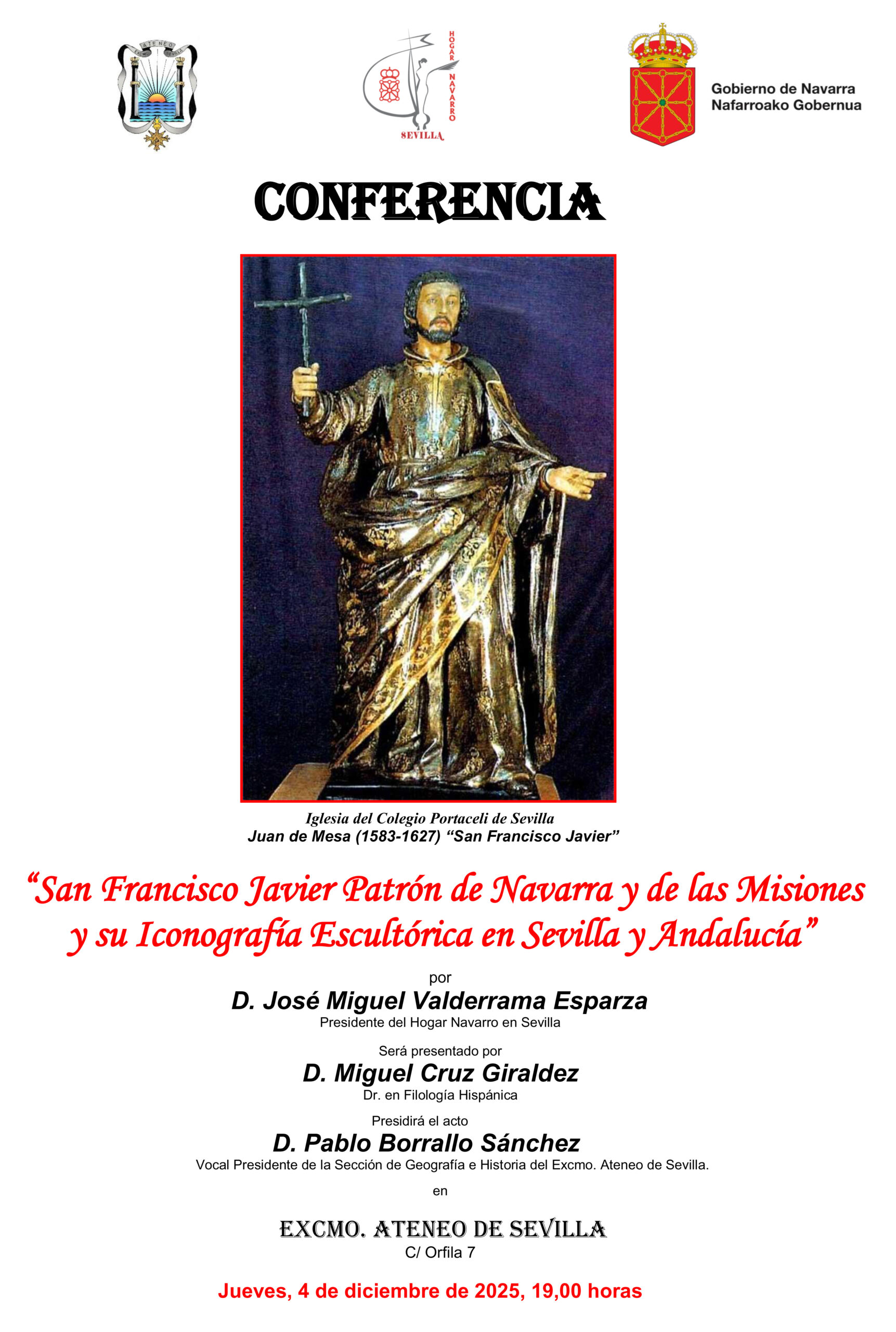 El Presidente del Excmo. Ateneo de Sevilla, en colaboración con el Presidente del Hogar Navarro en Sevilla, invita cordialmente a todos los socios, amigos y público interesado a la conferencia titulada: “San Francisco Javier, patrón de Navarra y de las Misiones, y su Iconografía Escultórica en Sevilla y Andalucía”
