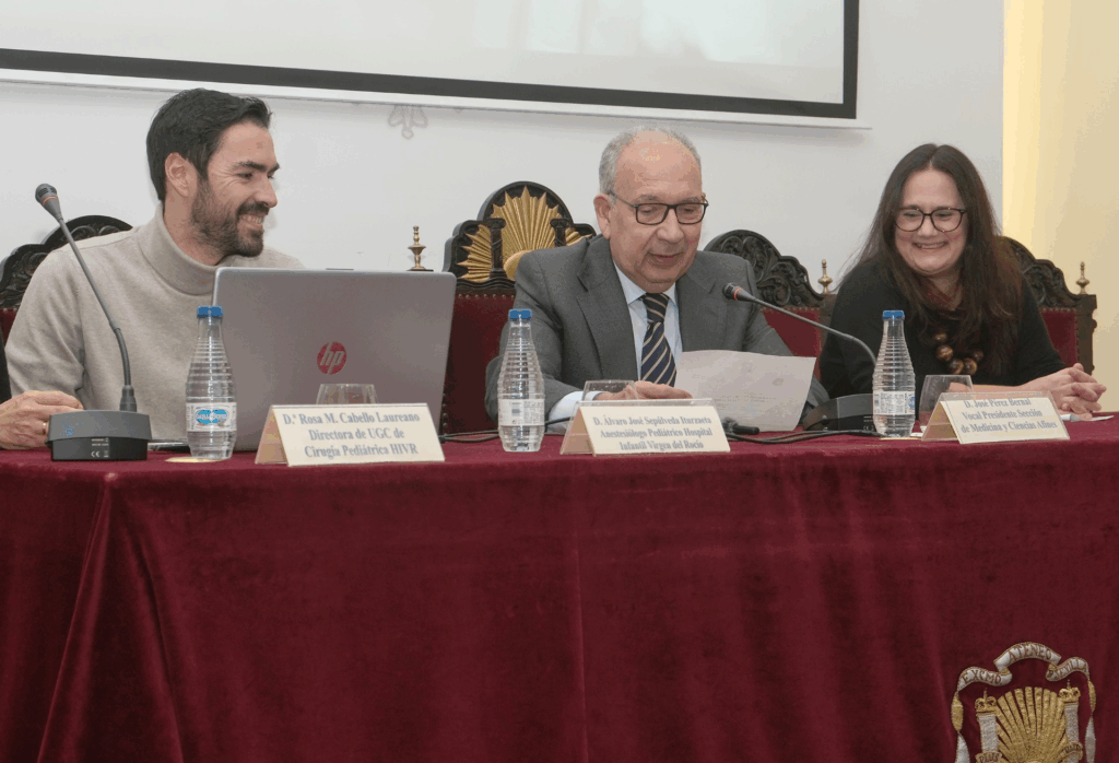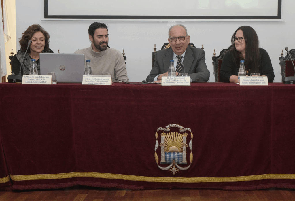 La mesa redonda contó además con diversas intervenciones que abordaron distintos aspectos de la cooperación sanitaria. D.ª Débora Moreno Borrego, enfermera del Bloque Quirúrgico del Hospital Infantil Virgen del Rocío, reflexionó sobre la importancia de la conciencia planetaria; D. Álvaro José Sepúlveda Iturzaeta, anestesiólogo pediátrico del mismo centro, analizó la adaptación a los medios disponibles en contextos con recursos limitados; y D.ª Rosa M. Romero Ruiz, jefa de la Sección de Cirugía Pediátrica Urológica, expuso los retos quirúrgicos a los que se enfrentan los equipos en estos entornos.