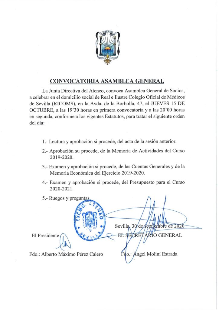 CONVOCATORIA. Asamblea General de Socios. Jueves 15 de octubre. Salón de Actos Colegio de Médicos de Sevilla. 19.30 horas 1ª conv.- 20.00 h. 2ª convocatoria